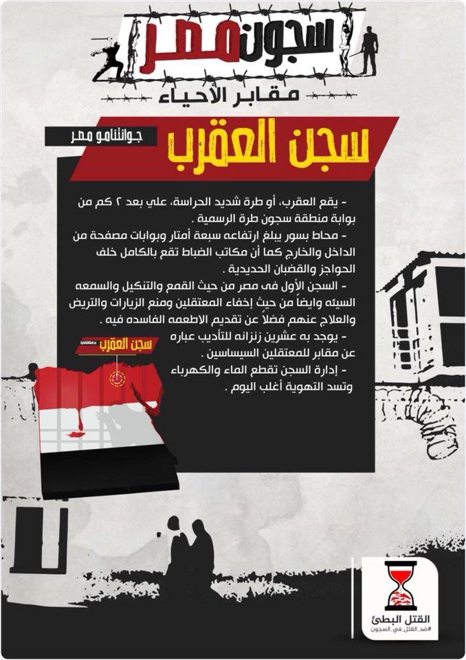 إضراب معتقلي الإعدام بـ #العقرب. دخل معتقلي عنبر الإعدام بـ "#سجن_العقرب" في إضراب عن الطعام منذ اليوم الخميس 8 مارس، وذلك احتجاجا على سوء المعاملة وتصاعد الإنتهاكات بحقهم داخل السجن، وللمطالبة بالوقف الفوري لها. وبحسب الأهالي فقد قامت إدارة سجن العقرب بتجريد المعتقلين من متعلقاتهم الشخصية من غطاء وأدوية وطعام، هذا فضلاً عن حرمانهم من الزيارة وإغلاق الكانتين والكافتريا، بالإضافة لوضع 8 أفراد في غرف ضيقة لا تكاد تكفي شخص واحد. واستنكر الأهالي مايحدث لذويهم من إنتهاكات داخل عنبر الإعدام، وكأن حُكم الإعدام وحده لا يكفي ليتم حرمانهم من سُبل المعيشة الآدمية داخل السجن.