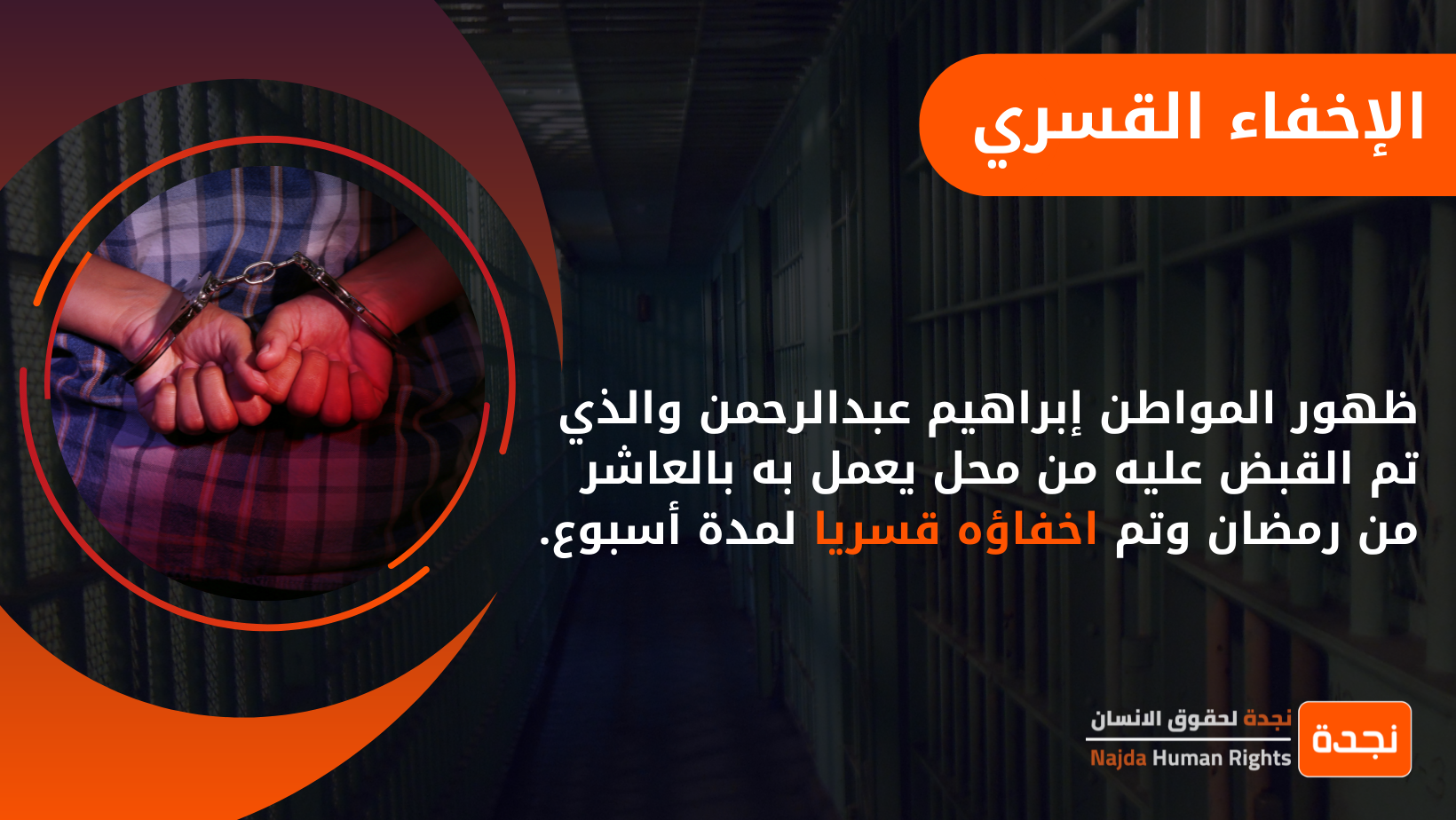 ظهر يوم الأربعاء الموافق 16 مارس 2022 المواطن إبراهيم عبدالرحمن والذي تم القبض عليه من محل يعمل به بالعاشر من رمضان وتم اخفاؤه قسريا لمدة أسبوع.