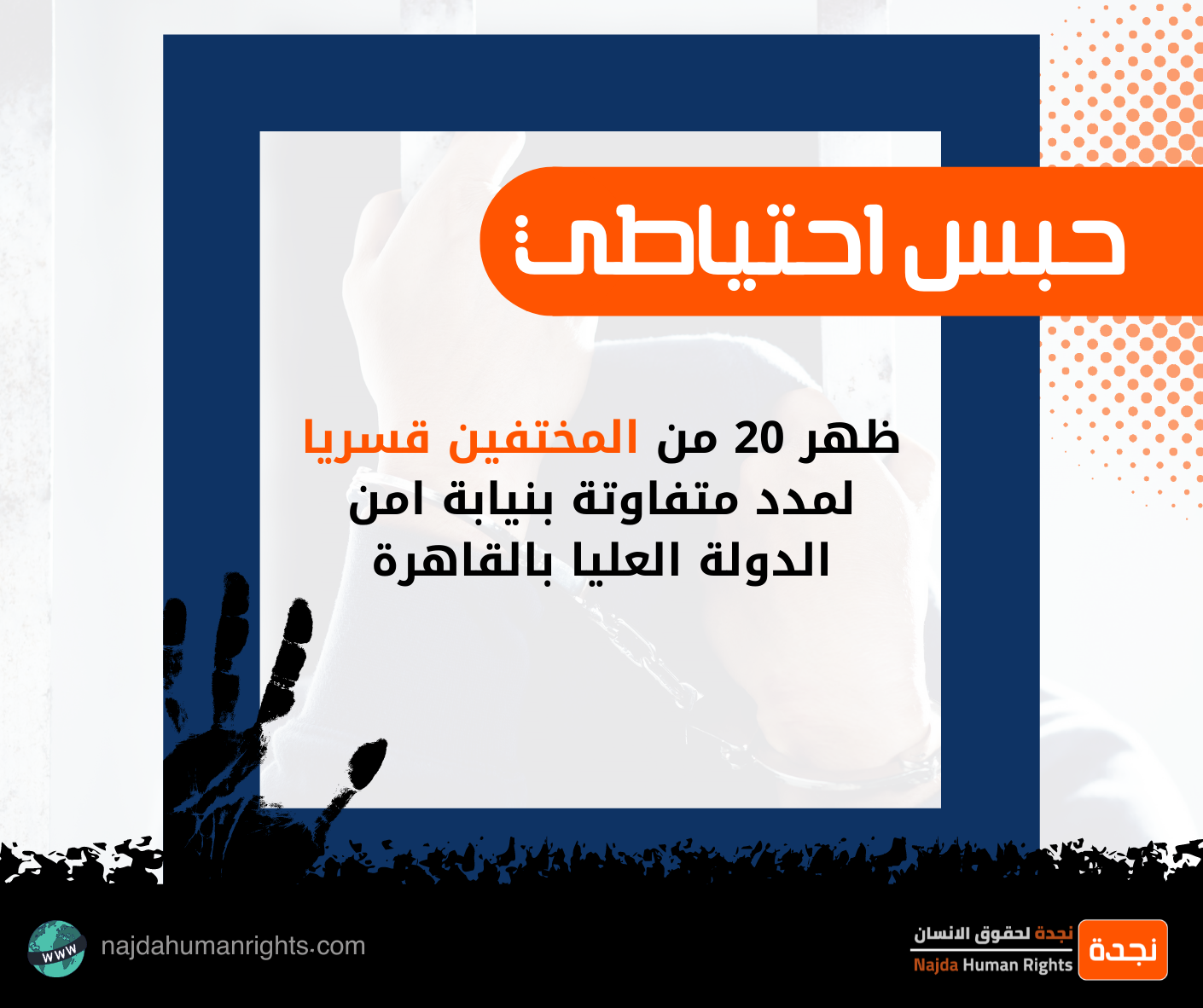 Twenty of those forcibly disappeared for varying periods appeared at the Supreme State Security Prosecution in Cairo, and the Public Prosecution decided to imprison them for 15 days pending investigations, and they are: