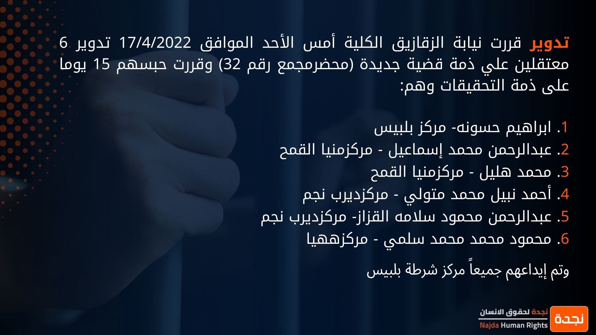 تدوير قررت نيابة الزقازيق الكلية أمس الأحد الموافق 17/4/2022 تدوير 6 معتقلين علي ذمة قضية جديدة (محضرمجمع رقم 32) وقررت حبسهم 15 يوما على ذمة التحقيقات وهم: